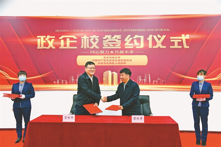 大庆市红岗区与东北石油大学签署战略合作框架协议。图片由大庆市红岗区工业信息科技局提供