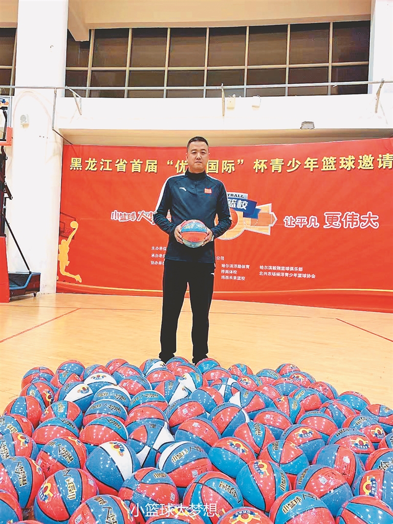 宋堂海开始与当地学校合作“篮球进校园”公益活动,本文开头提到的场景,便是宋堂海在鸡西市特教中心教孩子们打篮球。随着激昂的《相信自己》乐曲响起,操场上百余名身着黄绿色运动装的学生开始做热身运动。三名身穿红色运动装的教练员在队伍中穿梭,他们的声音清晰而坚定:“双脚与肩同宽,身体半蹲,右手运球,左手抬起护球……”宋堂海不仅口头指导,还亲自示范,他们的每一个动作都那么专业而优雅。篮球“砰砰砰”的击打声与孩子们欢快的笑声相互呼应,洋溢着运动的活力和青春的朝气。