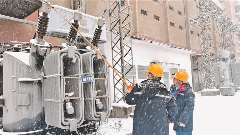 华电能源巡检人员在清理高备变压器积雪。本报记者 董盈摄