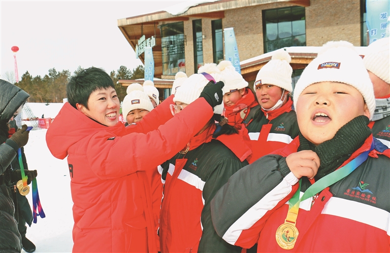 日前,冬奥会女子短道速滑3000米接力冠军张会被授予“宝清县百万青少年上冰雪梦想大使”称号,在宝清县,她向学生们传授了滑冰技巧,与孩子们一起赏冰乐雪,共同感受冰雪带来的魅力,带动更多的青少年追逐冰雪梦想。图为张会为孩子们颁发奖牌。 本报记者 郭俊峰摄