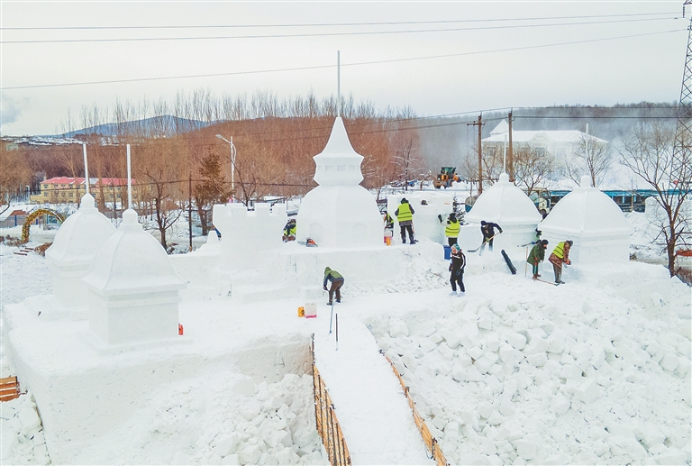 双鸭山市尖山区第二届“冰雪嘉年华”景区建设正在紧锣密鼓地进行中,景区以“逐梦新尖山 冰雪欢乐谷”为主题,以冰雪活动为核心,充分展示尖山区冰雪旅游资源、特色文化、人文风情,着力打造充满欢乐、刺激、创新的冬季旅游盛宴。图为工作人员正在制作冰雪城堡。本报记者 潘宏宇摄