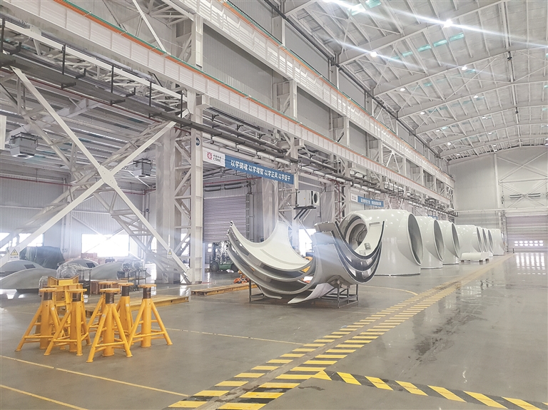 中车·嘉泽新能源装备制造基地组装车间内,几台风力发电机主机组装下线准备发往外地。