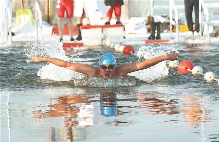 冬泳爱好者在冰冷刺骨的“天然泳池”里劈波斩浪。