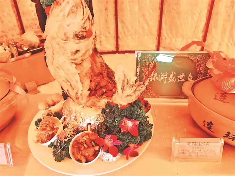 大庆市连环湖温泉景区厨师长周长来用在现场捕捞的野生鱼制作了连环湖鱼头煲、环湖盛世鱼、花开富贵鱼等佳肴,游客们争相品尝。