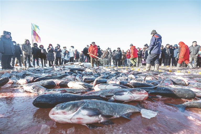 在活动现场,经验丰富的鱼把头祭湖醒网,渔民们豪气万丈,扛起渔具,迈着坚实的步伐,开始冬捕第一网。大型机械绞盘哗哗地转动起来,湖水泛花,千米巨网在冰下展开,在高亢嘹亮的号子声中,大网拉出冰面,大大小小的鱼儿活蹦乱跳在网中打着滚儿、撒着欢儿跃上冰面,异常壮观。据统计,活动当天,最大单网出鱼量约30万斤,总捕捞数量高达100万斤。