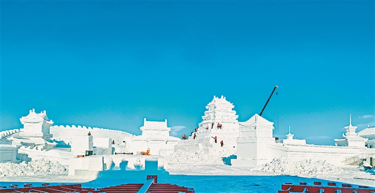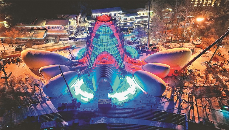 该主体建筑高28.5米,用冰量8000立方米。为了抢抓工期,参与施工的建设者们战冰雪、斗严寒,昼夜施工,冰建工人、雪雕匠人、电工、特种设备操作工、技工、安全员、监理等近千人均在紧张有序地忙碌着。从采冰、验冰、建设到灯光布设等各个环节精益求精,全速推进各项工作开展,确保开园前各项准备工作圆满完成。