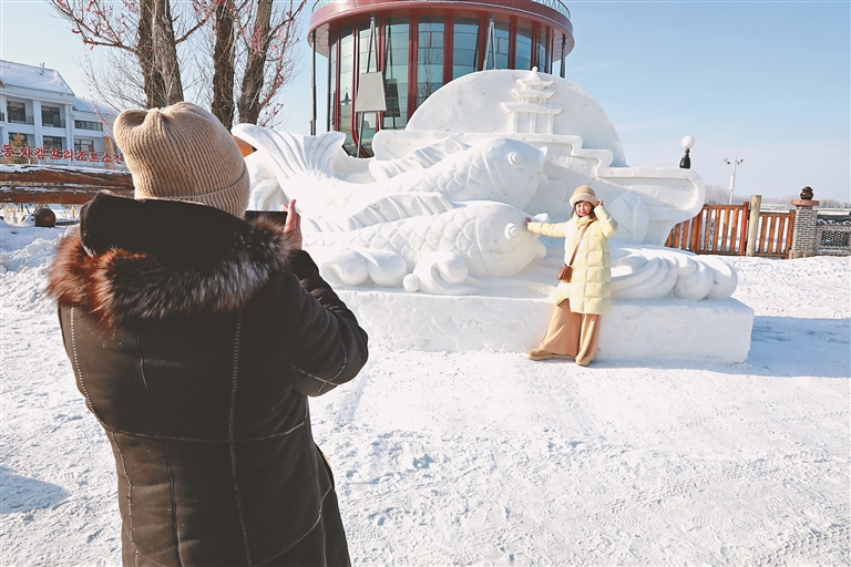 村口,一排憨态可掬的小雪人担任迎宾,左边是雪雕大赛的作品、雪地足球场、雪雕长城观赏围栏。湖上彩色的帐篷里,冬钓爱好者正在专心致志地等鱼上钩。滑雪场的嬉雪区里,游客打着雪圈发出愉快的呼喊。