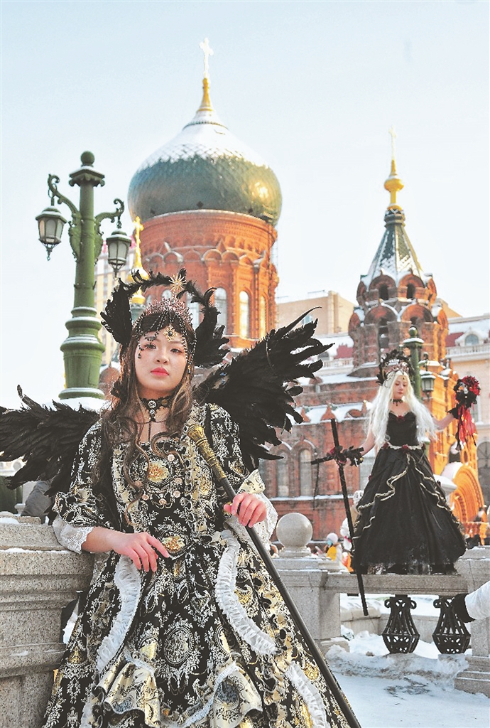 2023年11月以来,随着冰雪季到来,哈尔滨冰雪旅游的热度持续升温。第三方平台数据显示,近期哈市旅游热度环比暴涨300%,成为冬季国内旅行目的地绝对的“顶流”。某社交平台的搜索条里,“冰城游必打卡地”排名中,索菲亚建筑艺术广场一直跻身前三,其中70%的数据支持来自于女性游客预约旅拍。近日,记者在位于道里区的索菲亚建筑艺术广场看到,许多身着西式宫廷服饰的女孩们,打扮成或梦幻或暗黑系的冰雪公主、女王等造型,在专业摄影师的指导下,以索菲亚教堂为背景拍摄写真。