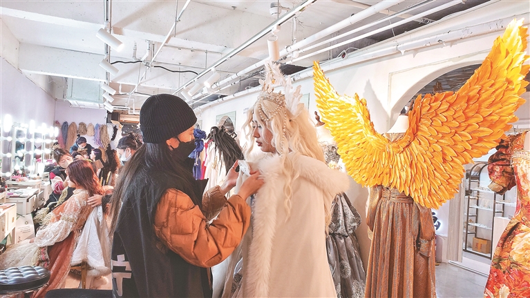 金太阳商城4楼另一家规模比较大的旅拍店店主蔡昕从事这个行业已经有五六年的时间了。他之前在大理、延吉等地拍摄一些旅拍创意视频发布在网络上,吸引了众多粉丝,很多顾客在网上跟他预约拍照。蔡昕认为,旅拍的出现是偶然中的必然,一个新消费热点的出现,往往能带动一个产业的出现和成长。“旅拍”这个突然出圈的新消费,自然也为相关产业带来乘数效应。“最近一个月,不仅金太阳商城摊位出租火爆了,就连化妆师和修图师都紧俏起来,很多家工作室都在高薪招聘化妆师、造型师,工资按天结算。”