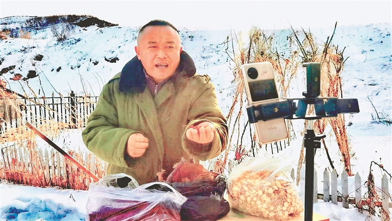 “北五味是绥芬河特产,纯野生的,咱们自己采摘的,晾晒两个月……”谷盈新邨的直播基地里,带货主播张清林正在户外开直播。只见他穿着军绿大衣,站在雪地里,卖力地介绍着绥芬河本地产的木耳、榛蘑、刺五加等山货。