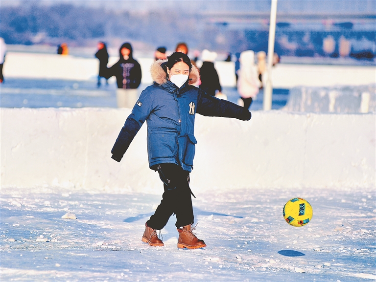 近日,哈尔滨市道里区松花江面,许多市民和游客在赏冰乐雪。
