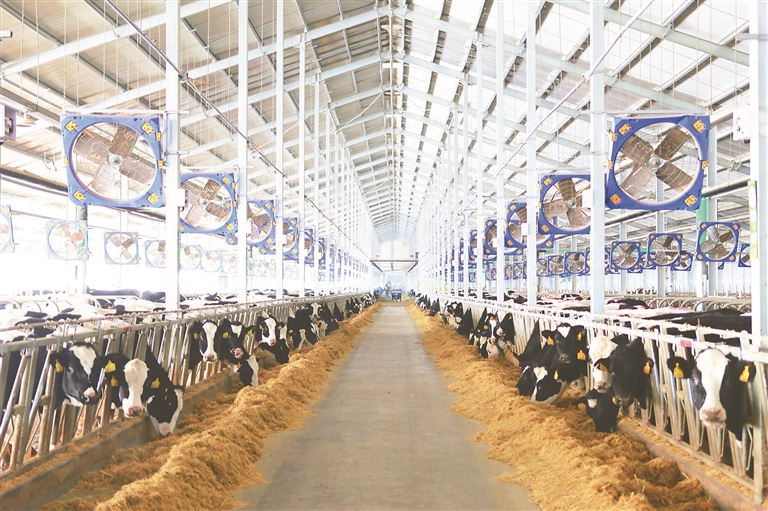 目前,一期5000头规模牧场已实现奶牛产奶;二期万头规模牧场土建工程已完成95%,牛舍已投用;三期万头规模牧场将在今年启动项目建设施工。未来,三座奶牛养殖场全部投入运营后,满栏状态下预计日产生鲜乳500吨以上,满足蒙牛集团(大庆)高端乳制品生产基地项目初期生产需求,年产值达7.5亿元。