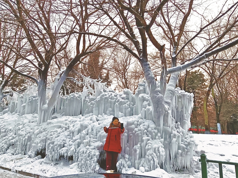 除了在公厕门前建造雪人,环卫工人们还在公园和景区门前建造了一些创意别致的冰雪景观。在香坊区远大生态园,两处大型树挂冰景,宛如玉瀑晶莹剔透,吸引众多游人打卡拍照。此处冰景造型由香坊区城管局清洁一中心主任李良川设计,环卫工人利用现有物资和园林部门提供的花架、松枝等搭建后浇筑,层层定型建造而成。