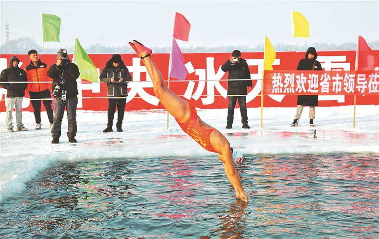 本报讯(记者刘艳)近日,一场热闹的冬泳表演活动在哈尔滨松花江冰雪嘉年华园区举行。来自哈尔滨市的10余名冬泳爱好者不惧严寒,跳入冰冷刺骨的松花江水中,在冬日里尽享属于他们的快乐,引来不少市民、游客驻足欣赏并点赞。