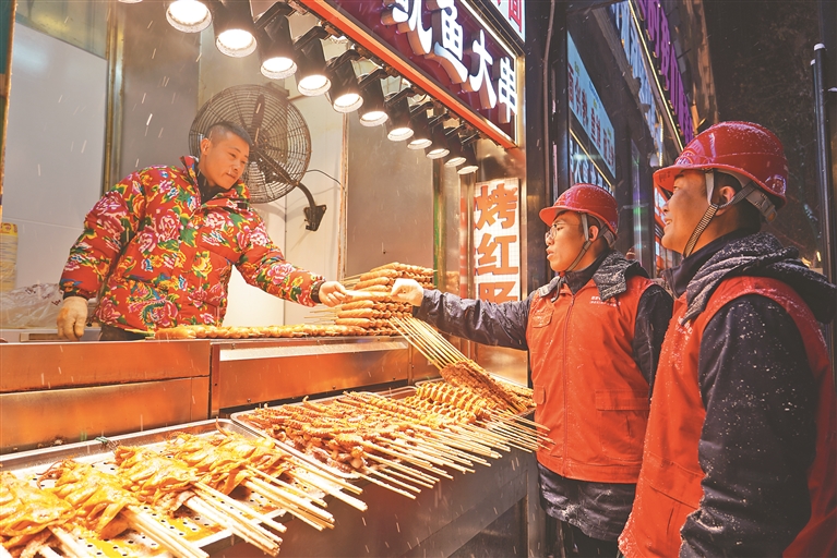 近日,国家电网黑龙江电力(李庆长)共产党员服务队副队长於炜人和队员刘晟阳走进中央大街步行街沿线餐饮商户,开展用电隐患排查及安全用电宣传,指导商户安全规范用电。“我们对旅游景区及商圈商户增加供电设备巡视频次,延伸供电服务,保障人民群众生产生活可靠用电。”於炜人说。