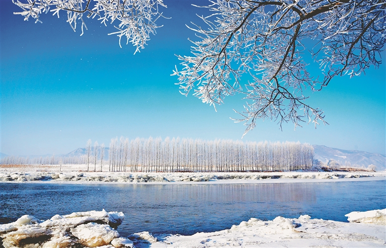 林口县雾凇谷位于莲花镇莲花电站大坝下游。莲花电站因间歇性发电,使下游江面冬季形成百里不封冻的特殊状态,也自然造化出冬季的百里雾凇奇观。图片由林口县委宣传部提供