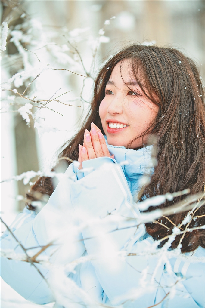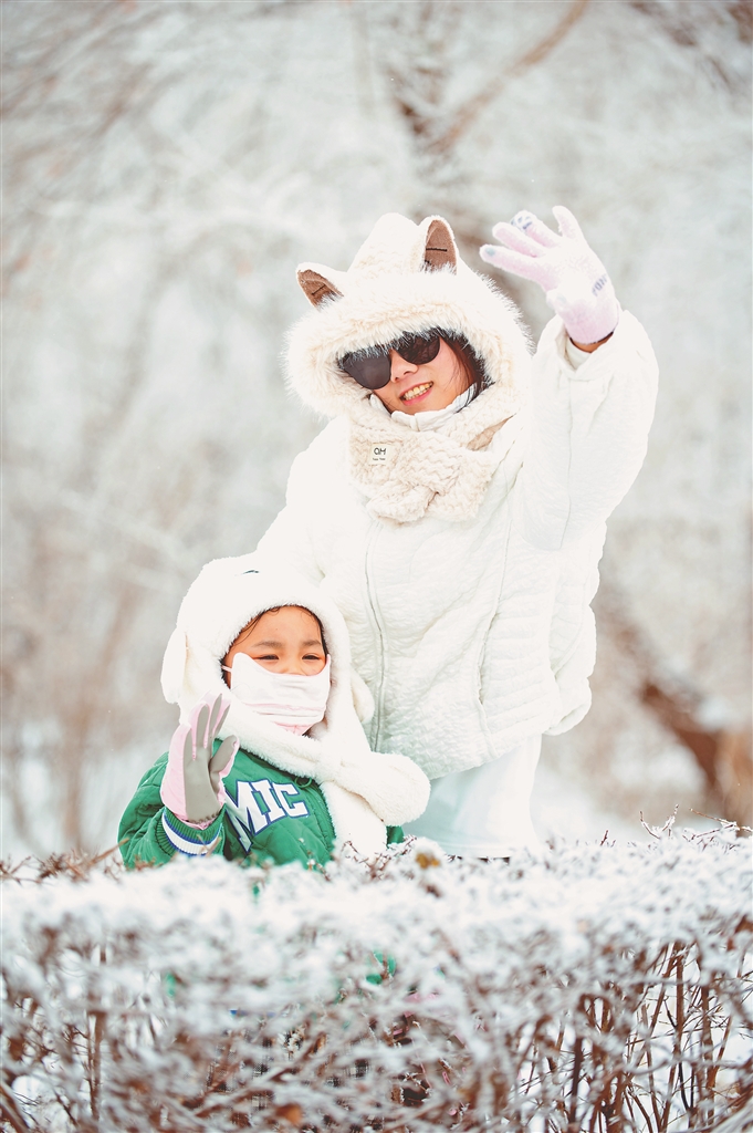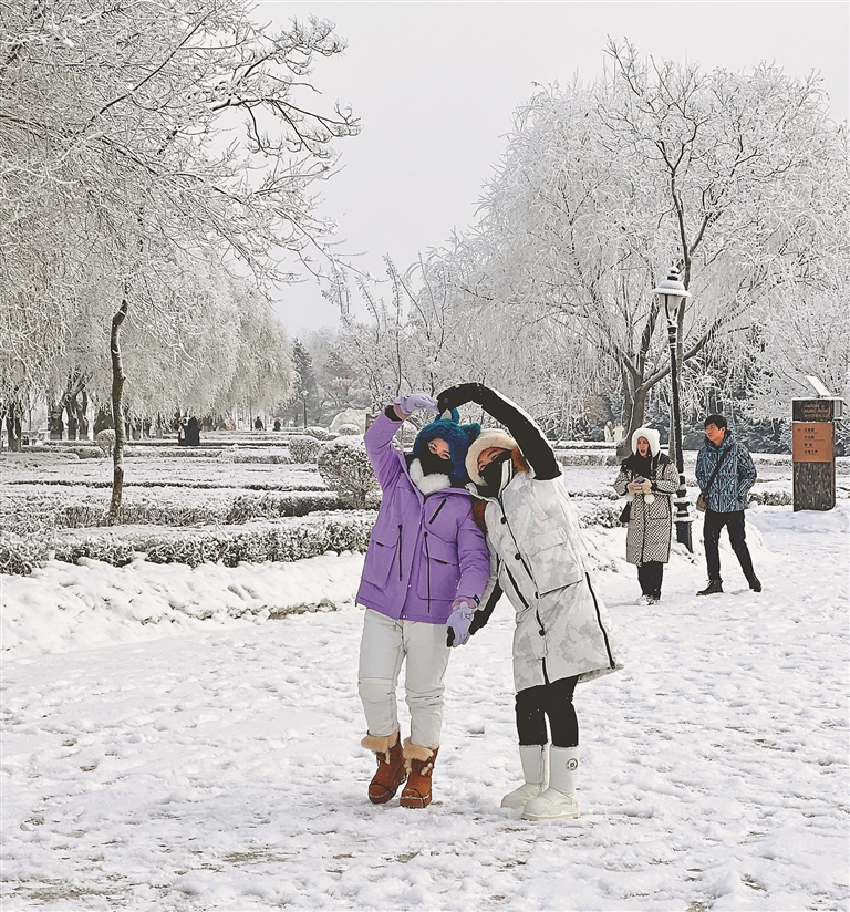 在太阳岛景区,游客们在雪地上尽情撒欢,争相与雾凇美景合影留念。本报记者 张春雷摄