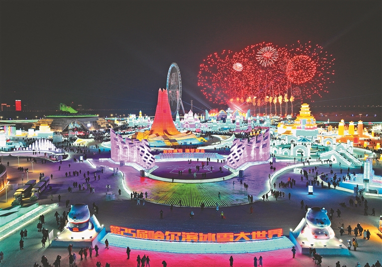 5日,第40届中国·哈尔滨国际冰雪节暨法中文化旅游年在哈尔滨冰雪大世界开幕。这是开幕式上的烟花表演。 本报记者 张澍摄