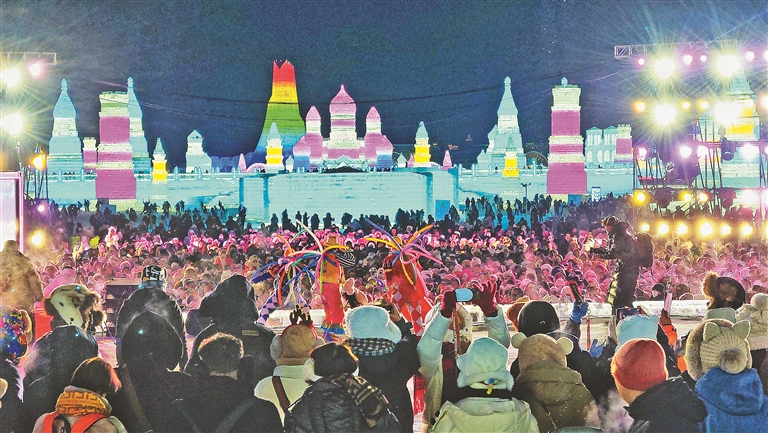 游客们激情被点燃,在哈尔滨冰雪大世界共同起舞。 本报记者 蒋国红摄