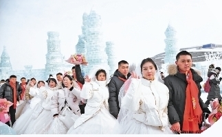 哈尔滨冰雪大世界园区里,伴随着悠扬的婚礼进行曲,35对新人在嘉宾和亲朋的见证下,牵手走过红毯,步上庄重喜庆的典礼台,许下爱的承诺,戴上象征永恒爱情的婚戒。婚典仪式结束后,新人们携手乘坐120米高的雪花摩天轮,俯瞰壮美的北国风光,还在太阳岛雪博会的主雪雕“龙腾福山”前拍照留念。