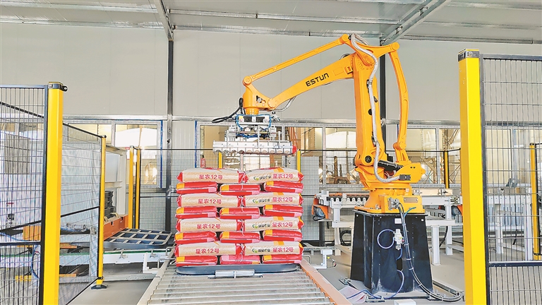 八五五农场粮贸公司经理邵鹏说:“我们基地今年新装的这个机械手臂,能实现全自动封袋包装、码垛功能,也可实现24小时不间断加工作业,提高了种子加工速度的同时,大大节省劳动力,节省空间,提高生产效率,达到了节本增效的目的,我们扩建种子晒场1.4万平方米,在扩大种子生产加工规模的同时,也保障了种子质量的提升。”