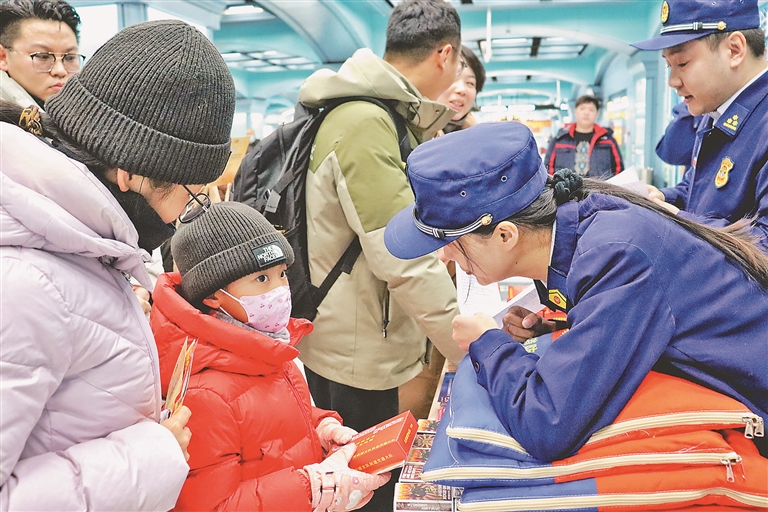 本报讯(刘略 记者蒋国红)近日,哈尔滨市消防救援支队轨道交通大队全员出动,来到哈尔滨地铁2号线冰雪大世界站开展“护卫冰雪旅游季”系列活动,在维护良好出游环境、保障南方游客生命财产安全的同时,提升消防安全意识,拓宽消防安全社会宣传面。