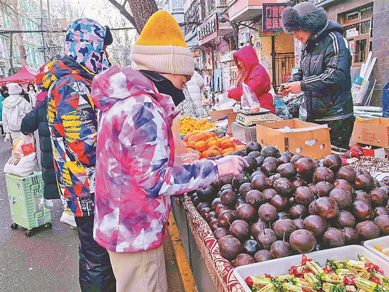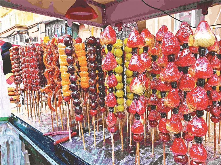 糖葫芦、冻梨、黏豆包、油炸糕……长长的街道上,摊主们的吆喝声此起彼伏,各种小吃香味扑鼻。在“万物皆可冰糖”的糖葫芦摊位,摊主们把糖葫芦做出了新花样。