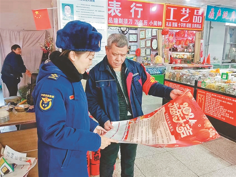 本报讯(刘略 记者蒋国红)为全力做好冬春火灾防控工作,坚决遏制“小火亡人”及居民家庭火灾发生,近日,哈尔滨市消防救援支队道里大队联合社区深入弱势群体家庭及“九小场所”开展“消防进万家 平安迎新春”消防安全宣传活动,为居民送上新年消防宣传海报。
