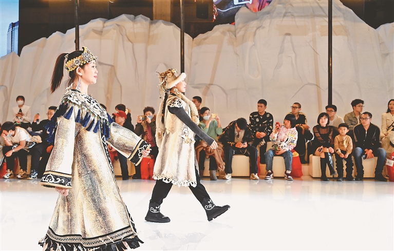 本次T台秀,同江赫哲族模特在舞台上跳起神杖舞和伊玛堪,用白桦林的鼓声和赫哲族的歌声,在时装周的时尚前沿展示了我省赫哲族的文化风俗和优美的民族服饰。本报记者 郭俊峰摄