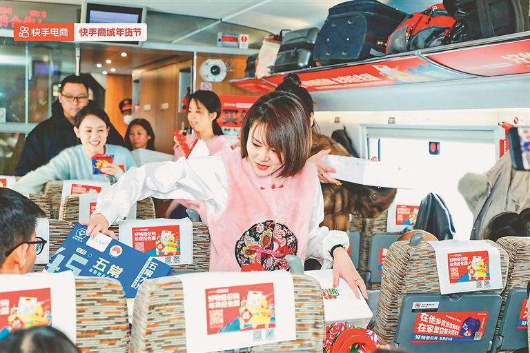 车外白雪茫茫,车内暖意融融,行李架和小桌板上,一张张年货节海报紧贴其上,将车厢装点得年味十足。车厢内,正在直播的主持人与快手电商主播“貂得衣大徒弟双双”“幂言欢姐”向游客们热情地派送哈尔滨红肠、五常大米、丹东草莓等东北好物,欢声笑语遍布整个车厢。“快手年货节主题车厢红红火火的,真喜庆!”“年货节的优惠力度真大,我很心动!”旅客们说。