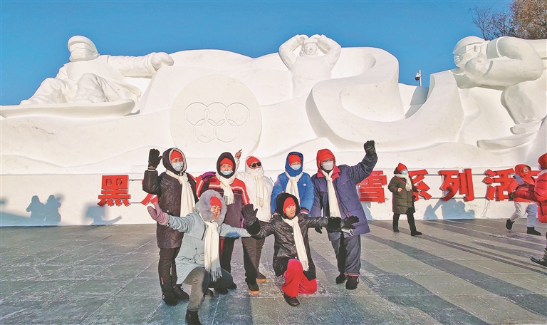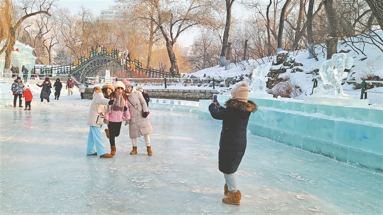 游客在哈尔滨松花江冰雪嘉年华园区合影。