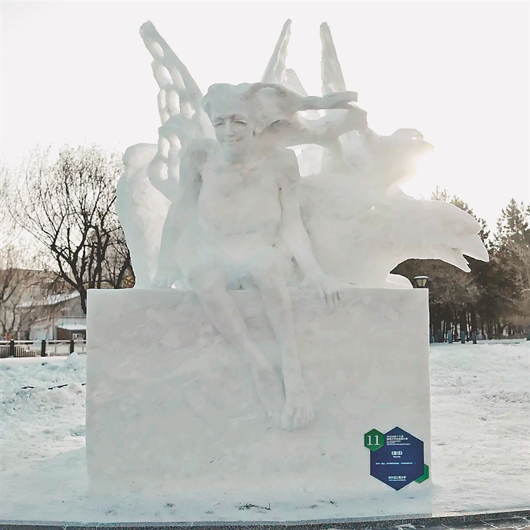哈工程冰雪艺术工坊负责人宋铭宇向记者介绍:“作品中的仙女翅膀需要在3米雪块的基础上增加1米的高度,这是一个很大的技术难点。为了完成这个作品,参赛队员们在3天内雕刻了27立方米的雪块。”