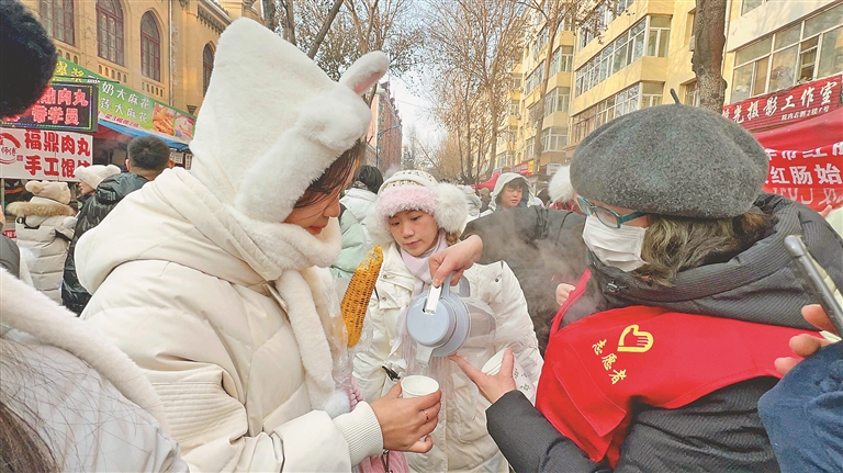 在红专街与通江街交口处,早市还设置了游客服务中心,不仅能充电、提供热水,还能寄存包裹,并兼具着失物招领处的功能。游客服务中心的大屏幕上滚动播出早市营业时间、公厕位置、客服电话等信息。志愿者们不时走出游客服务中心,为游客提供免费热水等服务。“在红专街早市不仅吃到了美食,还喝到了志愿者们送来的热水,心里暖暖的,哈尔滨来值了。”将哈尔滨之旅首站定为红专街早市的湖南游客兴奋地说。