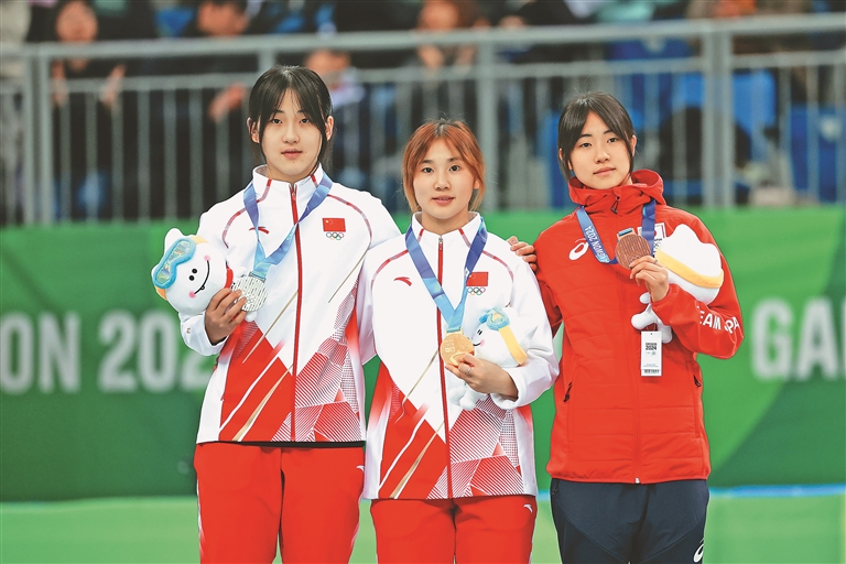 在人气火爆的江陵冰上运动馆,中国两位短道速滑运动员杨婧茹和李金恣在女子1500米比赛中巧妙配合,包揽冠、亚军。率先撞线的杨婧茹成绩为2分33秒148。