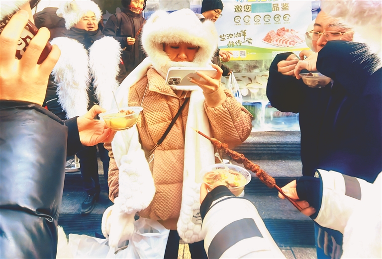 在位于西二道街附近的冰屋美食集市,工作人员则向游客免费发放美味的烤羊肉串和热气腾腾的羊肉汤。许多游客表示,真诚热情的哈尔滨让他们感到十分温暖。