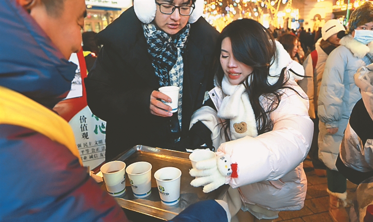 近日,在哈尔滨中央大街上,多位哈市市民端着托盘,给过往游客免费送出热气腾腾的红茶。