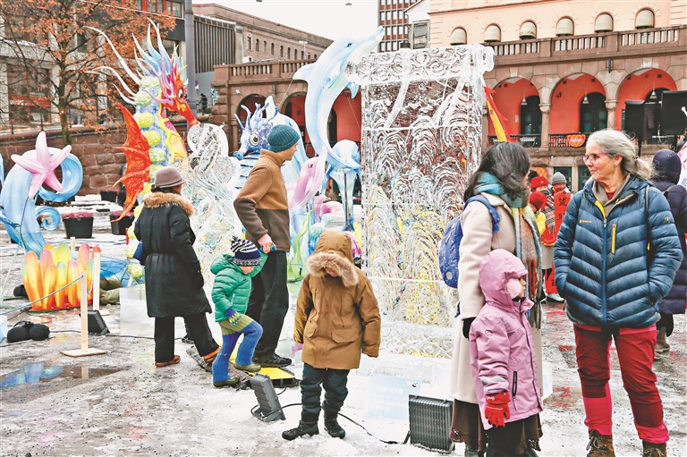 “你好!中国”冰雕彩灯艺术展1月28日在挪威首都奥斯陆开幕。由哈尔滨冰雕艺术家来挪威制作的冰雕作品和来自四川自贡的彩灯吸引了众多当地民众前来欣赏。新华社发