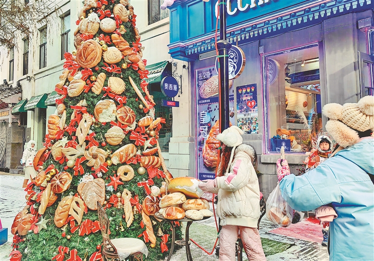 中央大街上,一座3.5米高的冰雕前后两面分别嵌入一架钢琴,供游客演奏、观赏。一些音乐爱好者纷纷上前一试身手,并拍照留念。在中华巴洛克历史文化街区,一棵挂满各种形状面包的松树吸引了许多游客打卡拍照。据了解,树上的面包都是街区内一家面包坊制作的,成为一道别样风景。