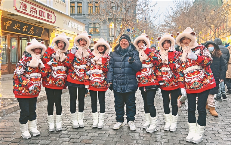游客在中央大街合影留念。本报记者 韩东贤摄