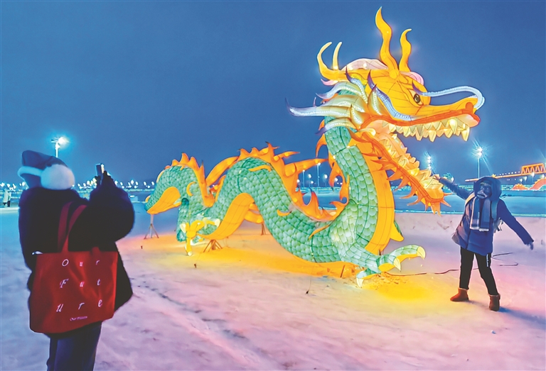 夜幕低垂,哈尔滨松花江冰雪嘉年华景区内的龙灯、彩灯纷纷亮起,引得一众游人驻足观看、拍照。据了解,为迎接新春佳节的到来,松花江冰雪嘉年华景区内布置了大量彩灯、花灯,营造出喜庆氛围。来到这里的游客在玩冰乐雪的同时,顺道观赏炫彩花灯。