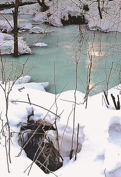 爬上脚下的这座山顶,太阳驱散了雪雾,一片混沌的雪谷顿时明亮起来,我们席地而坐,却意外地听到了雪下面泉水叮咚作响,顿时又神清气爽起来。高山流水,总有知音相伴。此时的流水声,让我们兴奋异常,忙摘下帽子,耳朵贴近雪面,静心聆听泉水的演奏。泉水叮咚,似乎有金属般撞击的声响,这山谷一下子添了几多神韵。这精灵的泉水,流淌了千年,滋养着原始森林的生灵万物,就是数九隆冬也封不住它自由的脚步,在雪下轻流,时而又回冲出冰雪覆盖与拦阻,到冰面上涌动,与冰雪又合作出万千物象来,任赏者生发无尽的想象。居高临下,再看这山谷,谷深涧渊,怪石嶙峋;丛林叠嶂,层次清晰。天高地阔,使这雪谷有了几分险峻感。