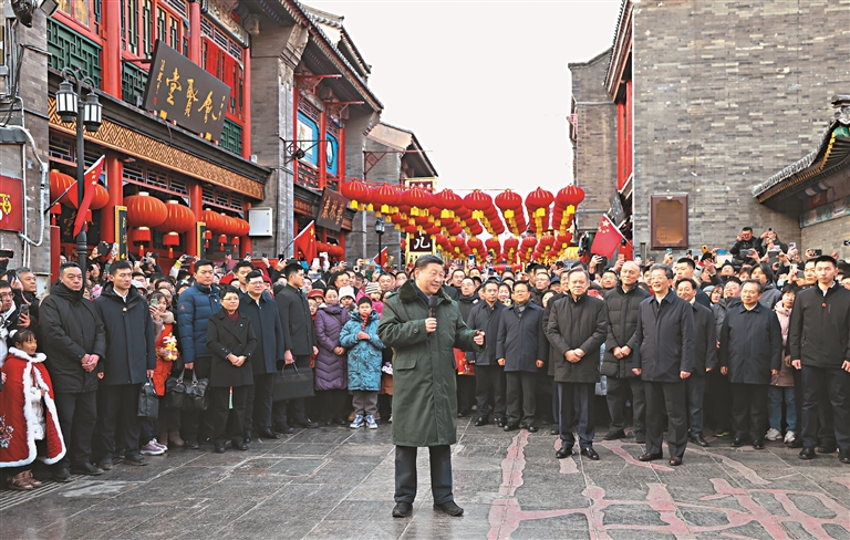 当天下午,习近平来到天津古文化街。街道古色古香,习近平沿街步行,先后走进桂发祥十八街麻花、果仁张、泥人张、杨柳青年画等特色店铺,了解产品种类、销售和传统文化传承发展等情况,同店铺业主、员工和现场群众互动交流。他说,各级党委和政府要加强节日期间民生商品的产销保供,确保数量充足、品类丰富、质量可靠,让广大群众放心消费、快乐过年。习近平指出,中国式现代化离不开优秀传统文化的继承和弘扬,天津是一座很有特色和韵味的城市,要保护和利用好历史文化街区,使其在现代化大都市建设中绽放异彩。