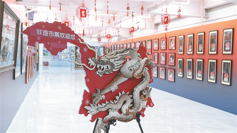 记者看到,这些展区分别汇集了老鼎丰中式糕点、哈尔滨红肠、清真传统糕点等15项特色美食,10个优秀非遗工坊项目以及桦树皮工艺品、鱼皮制品、满族刺绣、挂钱剪纸、年画等40余项近千件龙江非遗手工制品和文创产品,让市民、游客能“一站式”欣赏和采购到具有龙江特色的非遗年俗喜庆用品。此外,主办方还特别邀请了广东省、安徽省非遗工坊项目前来助阵,令观者大呼过瘾。