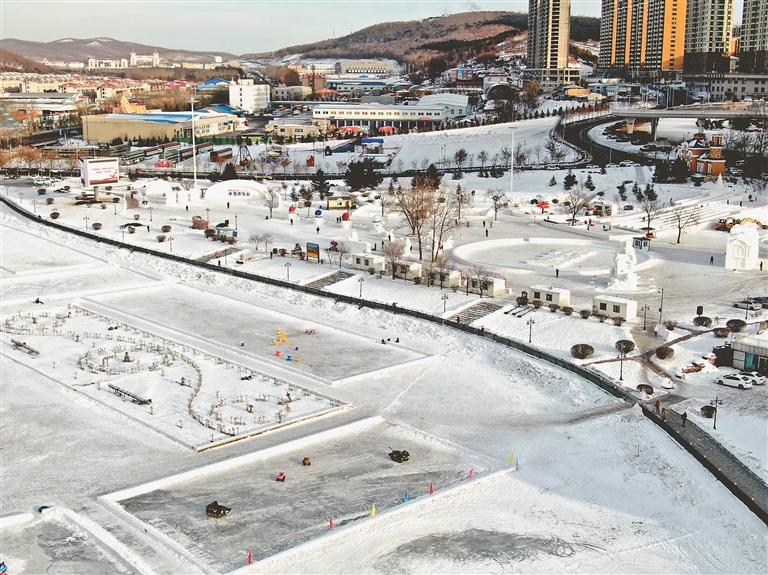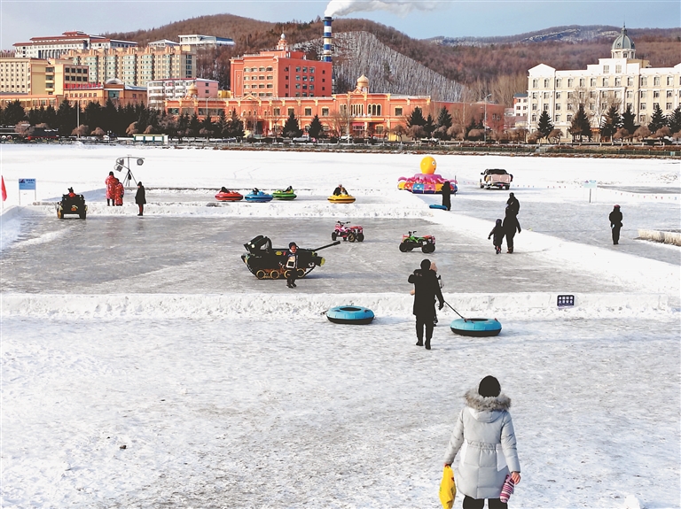 冰上摩托的轰鸣声、小吃摊上的吆喝声、儿童玩耍嬉戏声响彻整个冰雪欢乐谷。
