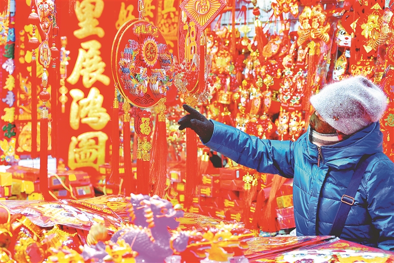 近日,哈尔滨市道里区一家年货批发市场内,购买对联、福字、灯笼、剪纸等龙年春节饰品的顾客络绎不绝。