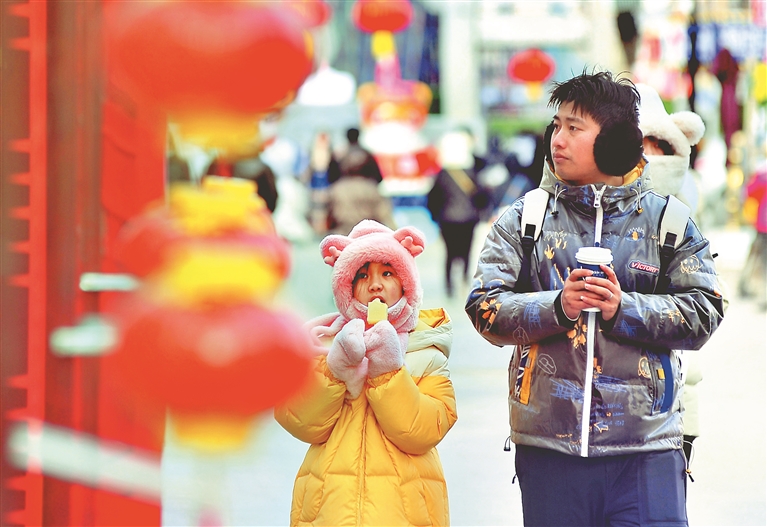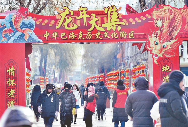 6日,哈尔滨市道外区三道街附近,游客们有的在观光游玩,有的在逛龙年大集。“大集”内展示许多老字号食品、手工艺品等,悬挂在路边的一串串大红灯笼烘托出浓浓的年味。在这里,游客们还可以观赏到美丽的冰雕和可爱的雪人,品尝到各种各样的美食。