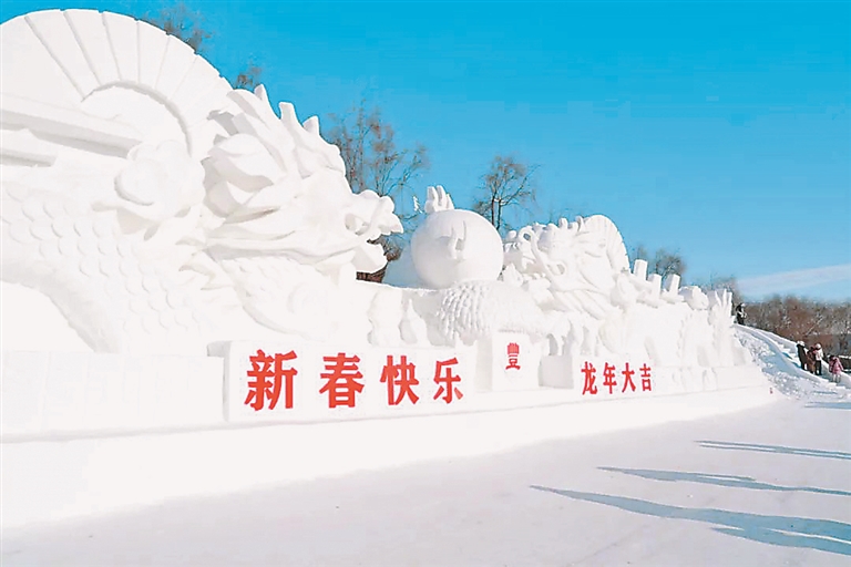 查哈阳农场冰雪乐园雪雕栩栩如生,吸引大量游客驻足欣赏。 祁岩摄