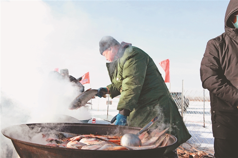 游客岳明明几乎年年到嫩江看冬捕,她高兴地说,老百姓过年就是要“年年有鱼”。