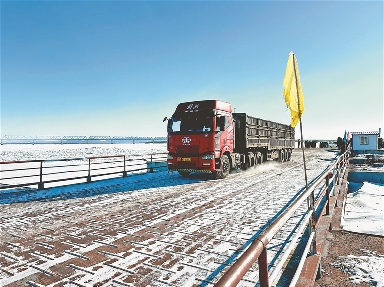 黑龙江同江口岸中俄浮箱固冰通道正式开通运营,正在进行冬季客、货运输。于滢摄