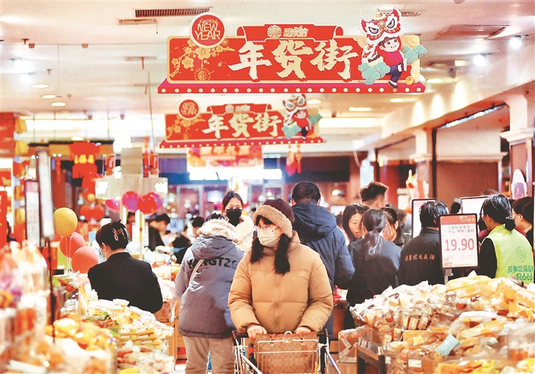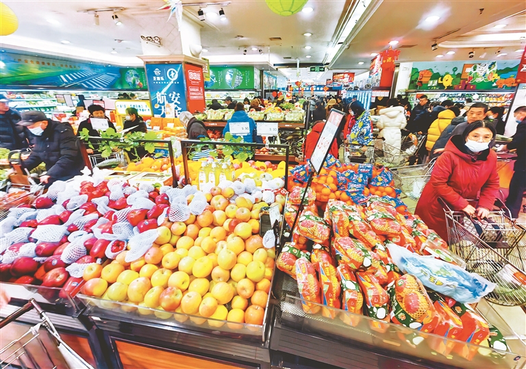 8日,哈尔滨市道里区一家大型超市内,购买节日用品的市民很多,非常热闹。大家推着购物车,一样样地挑选着自己心仪的商品。柜台上,新鲜水果、蔬菜、肉禽蛋奶、米面油盐、鱼虾蟹鲍等各种各样的货品琳琅满目,价格平稳。货品中有本地生产的,有从南方省份运来的,也有许多来自国外,种类繁多。